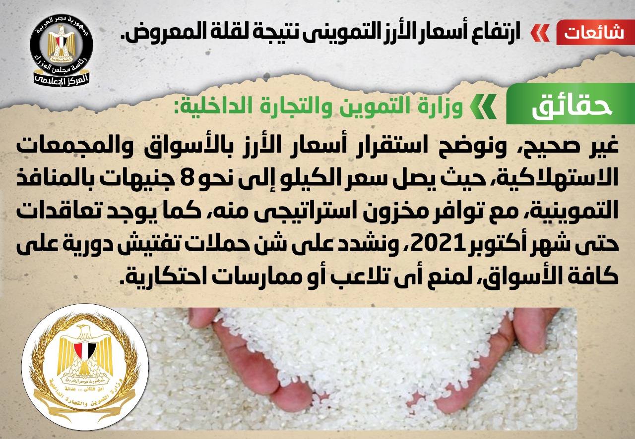 الوزراء ينفى ارتفاع أسعار الأرز التمويني نتيجة لقلة المعروض
