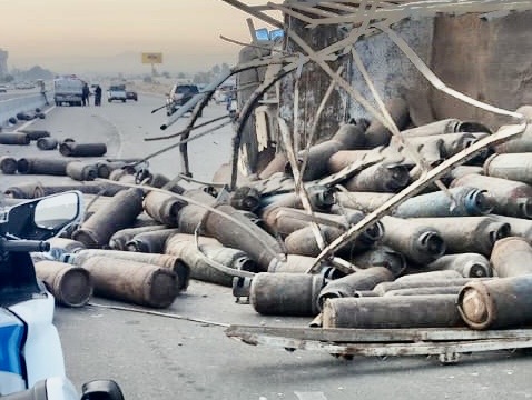 انقلاب سيارة محملة بأنابيب الغاز علي طريق الإسماعيلية السويس
