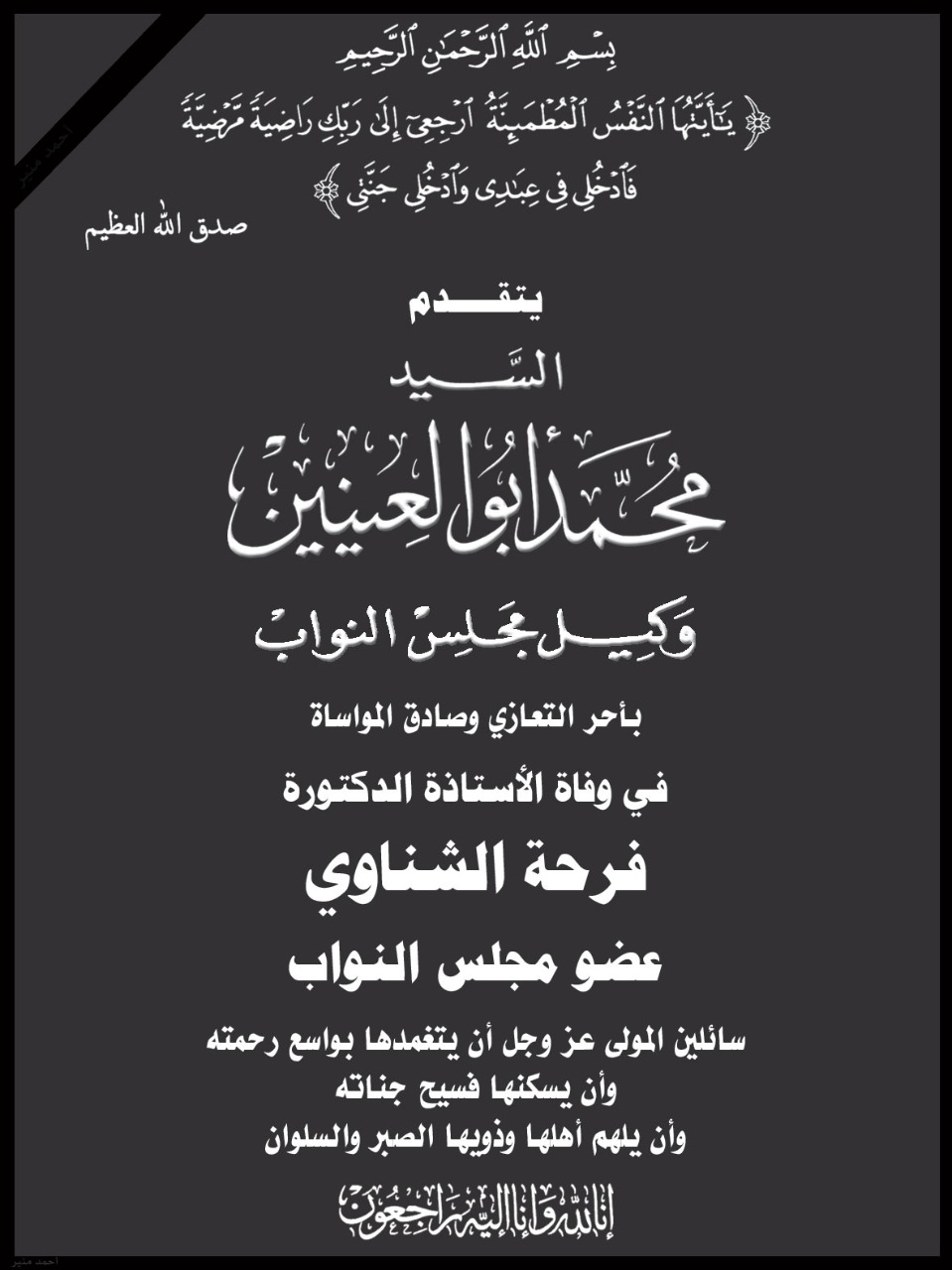ابو العنين ينعي الدكتورة فرحة الشناوي