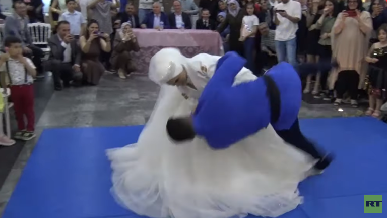عروسة تقوم بمباراة استعراضية وتطرح زوجها أرضا في حفل زفافهما
