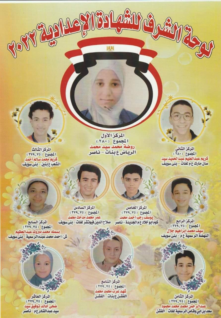%75.5 إعدادية بني سويف ١٠طلاب وطالبات فى لوحة شرف الاوائل