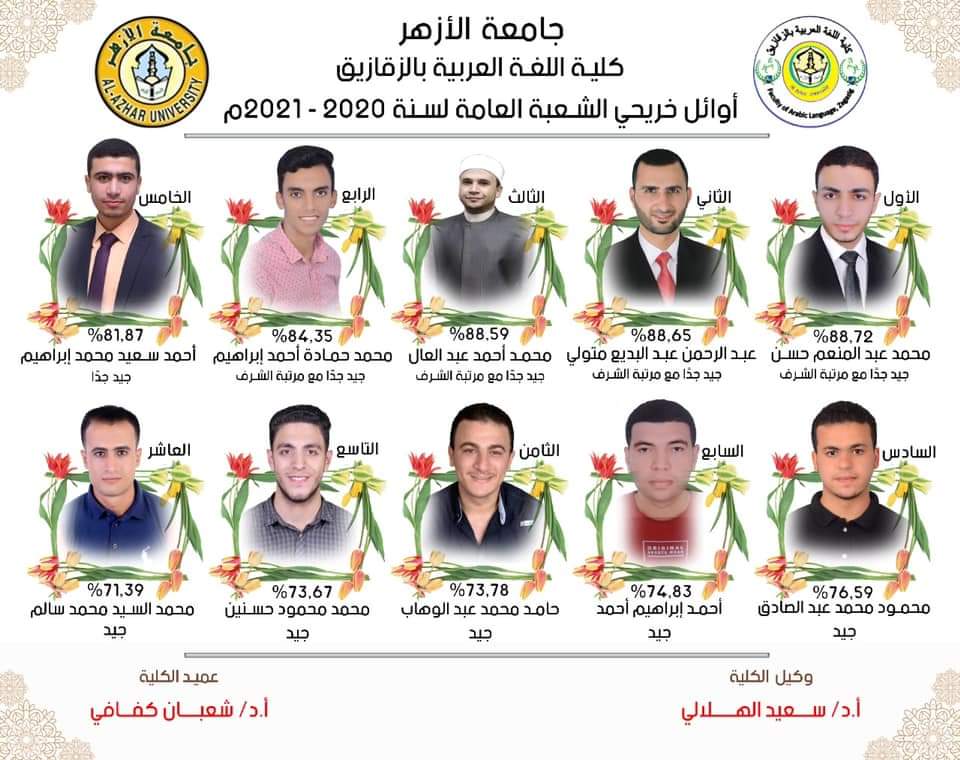 عميد كلية اللغة العربية بالزقازيق يعلن أسماء الاوائل العشرة للشعب الثلاث.. صور
