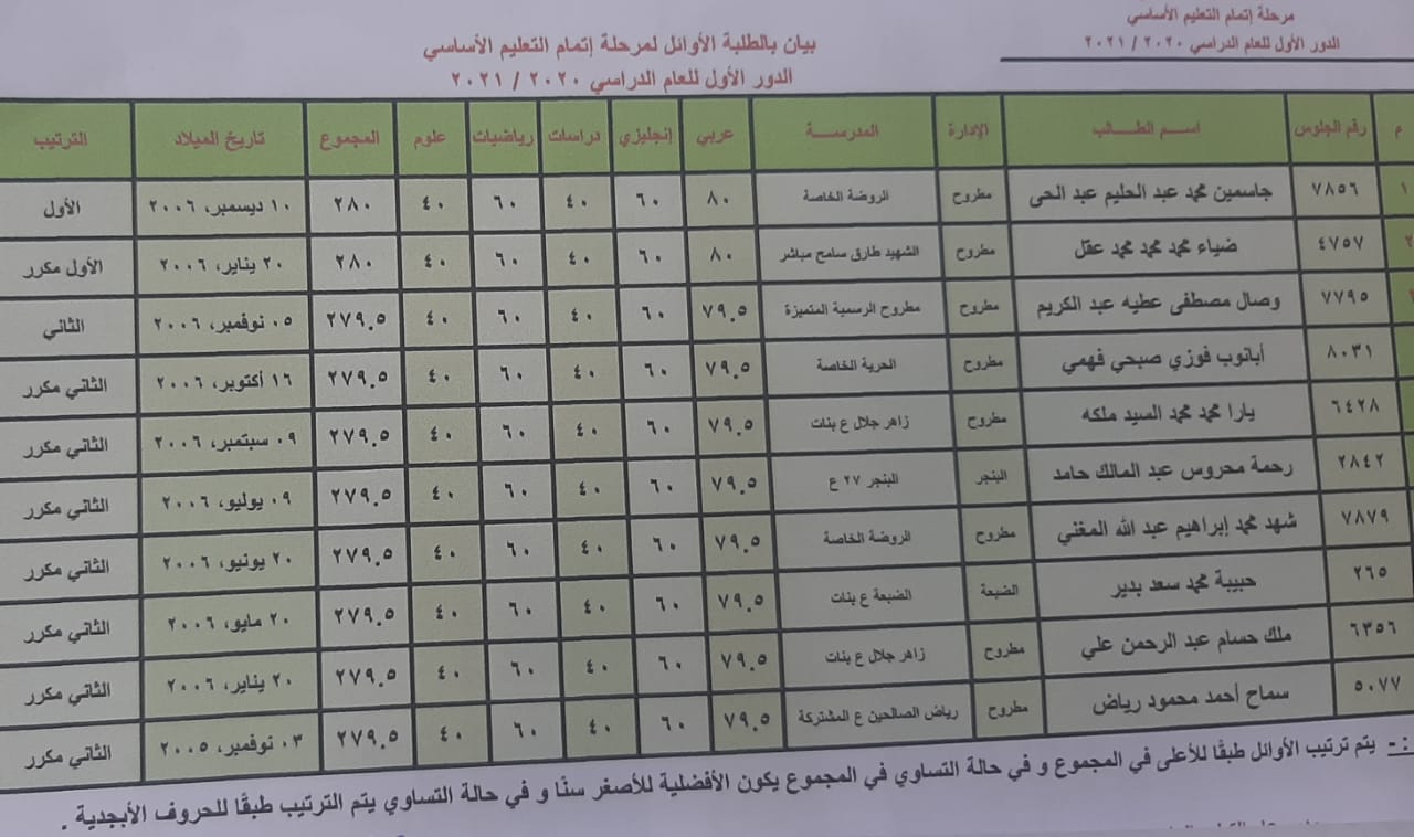 ننشر أسماء العشرة الاوائل في الشهادة الإعدادية بالإسماعيلية
