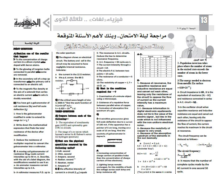 روشتة سحرية للتفوق اعدها خبراء فى صناعة الاوائل لامتحان الفيزياء لغات للثانوية العامة 2019 من ملحق الجمهورية