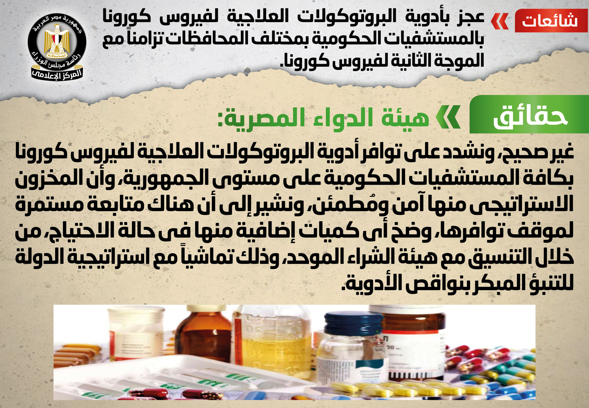 الحكومة تنفي شائعة نقص أدوية البروتوكولات العلاجية لفيروس كورونا
