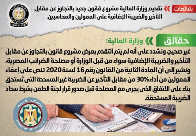 الحكومة تنفى تقديم وزارة المالية مشروع قانون جديد بالتجاوز عن مقابل التأخير والضريبة الإضافية على الممولين والمحاسبين