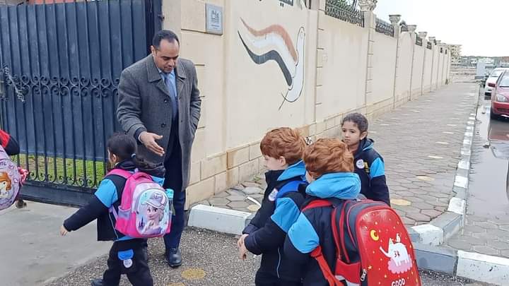 مدير مدرسة يستقبل التلاميذ أمام المدرسة ويهنئهم ببدء التيرم الثان