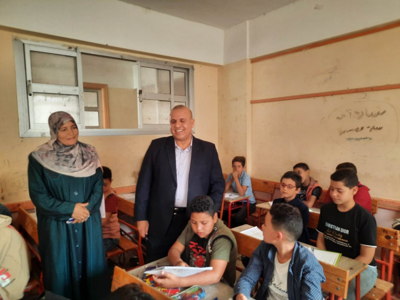 مدير مدرسة يستقبل التلاميذ أمام المدرسة ويهنئهم ببدء التيرم الثان