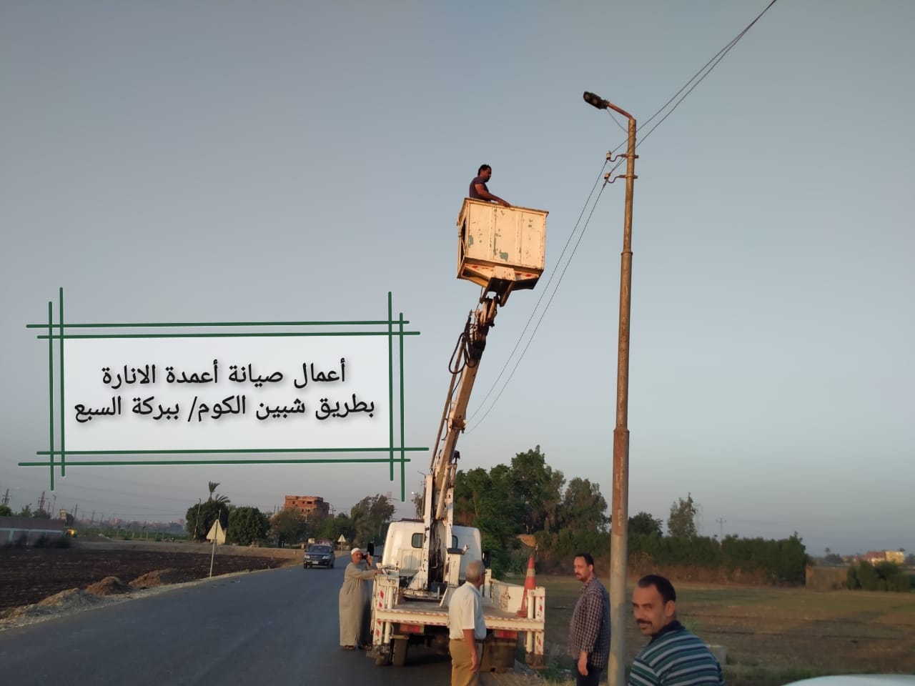 متابعات ميدانية لأعمال الصيانة الدورية لأعمدة الإنارة ببركة السبع والشهداء ومنوف