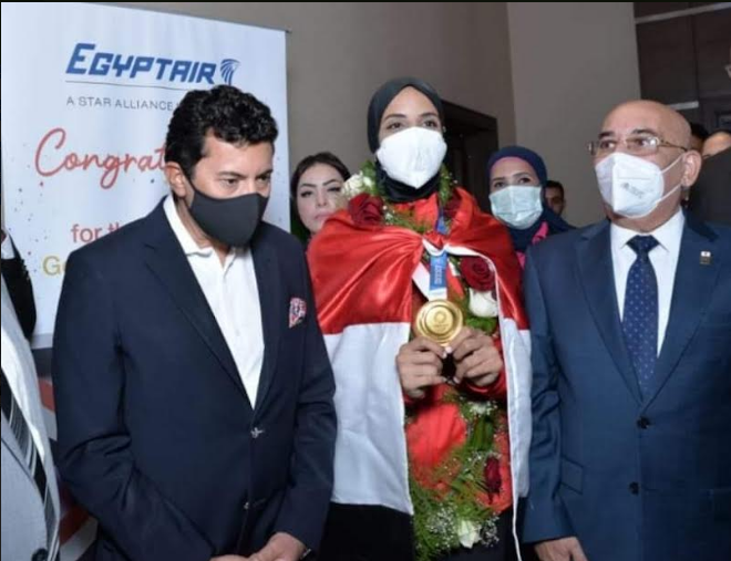 مصرللطيران تستقبل فريال أشرف وأحمد الجندي أبطال الذهب والفضة