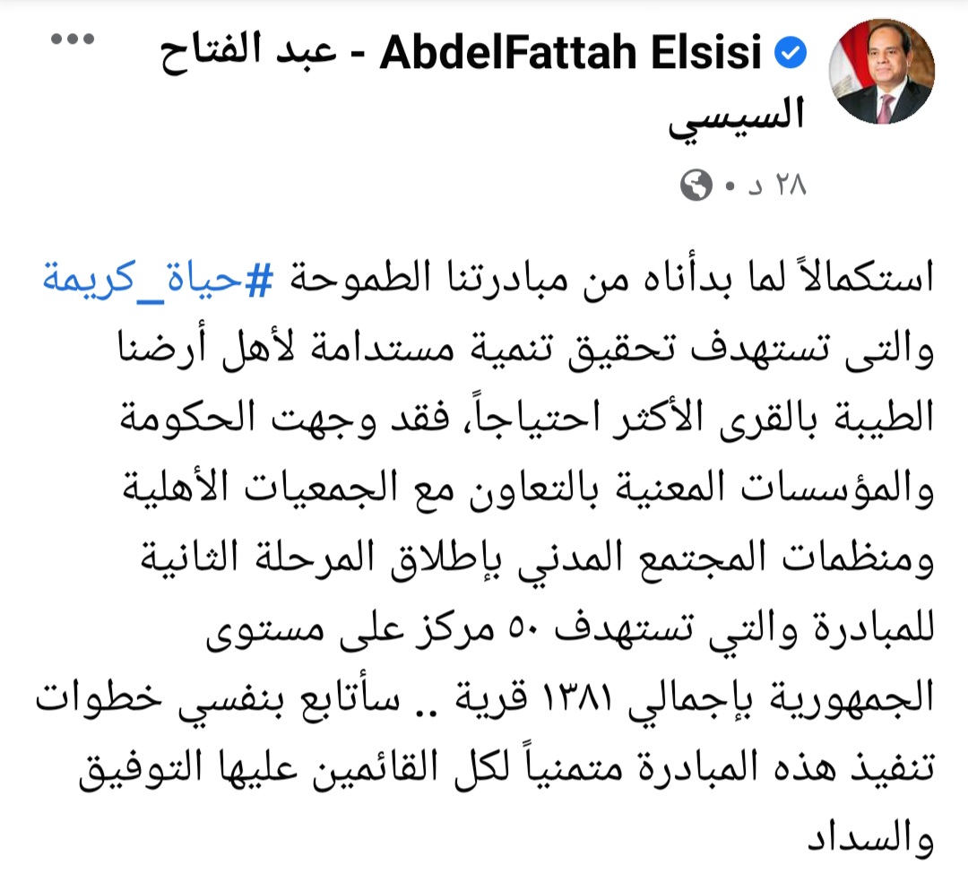 الرئيس السيسي : اتابع شخصيا مبادرة حياة كريمة واتمنى لكل القائمين عليها التوفيق والسداد