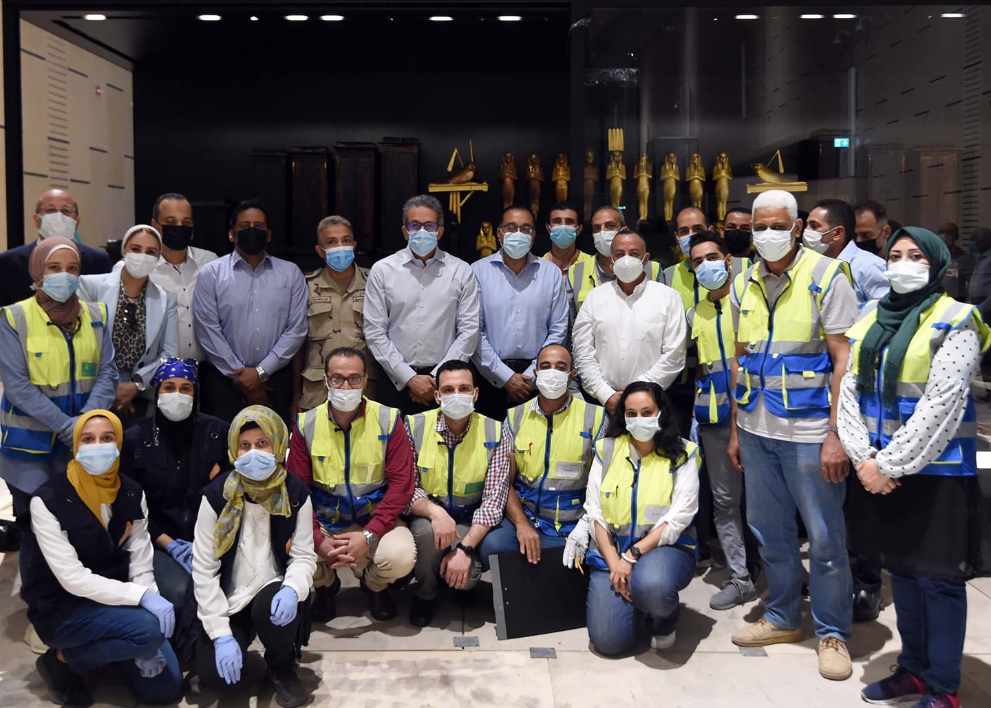 مدبولى يلتقط صوراً تذكارية مع القائمين بأعمال ترميم القطع الأثرية بالمتحف الكبير