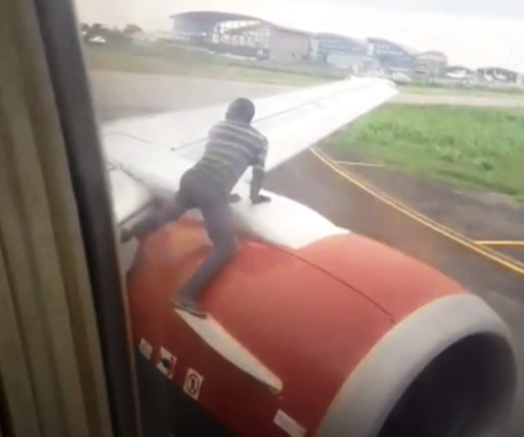 رعب" على جناح طائرة.. يتسلق المحرك للسفر إلى غانا.. فيديو