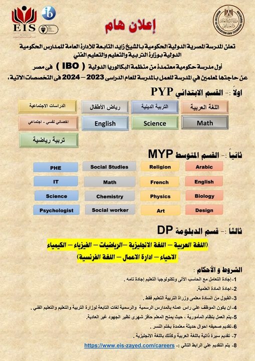 المدرسة المصرية الدولية بالشيخ زايد تعلن عن حاجتها لمعلمين