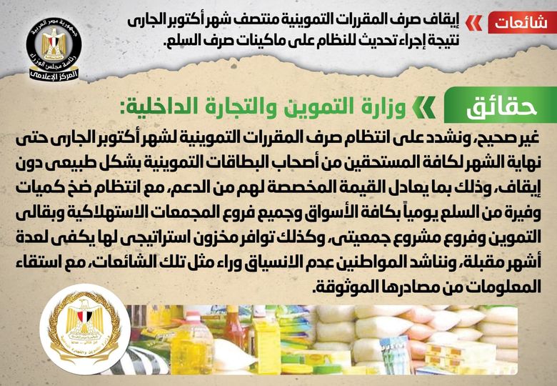 الحكومة تنفى إيقاف صرف المقررات التموينية منتصف شهر أكتوبر