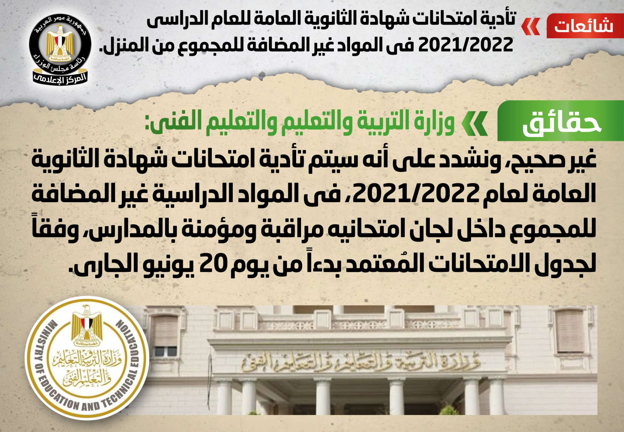 الحكومة تنفى تأدية امتحانات الثانوية العامة في المواد غير المضافة للمجموع من المنزل