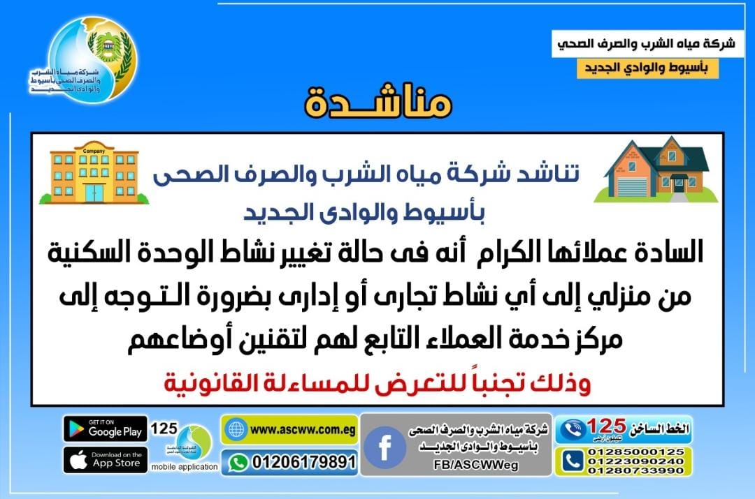 مياه أسيوط تناشد أصحاب الوحدات السكنية المخالفة لطبيعة النشاط بتقنين أوضاعهم