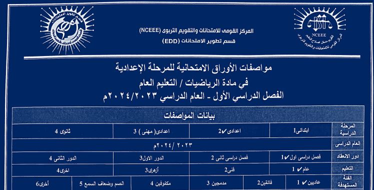 مواصفات امتحان الرياضيات للمرحلة الاعدادية -ترم أول