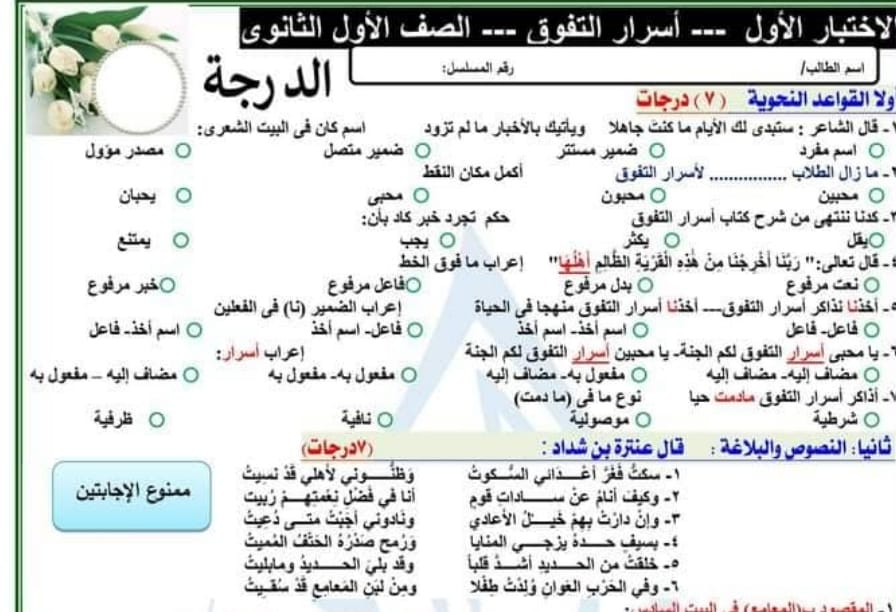 امتحانات مجابة في اللغة العربية للصف الاول الثانوي الترم الاول