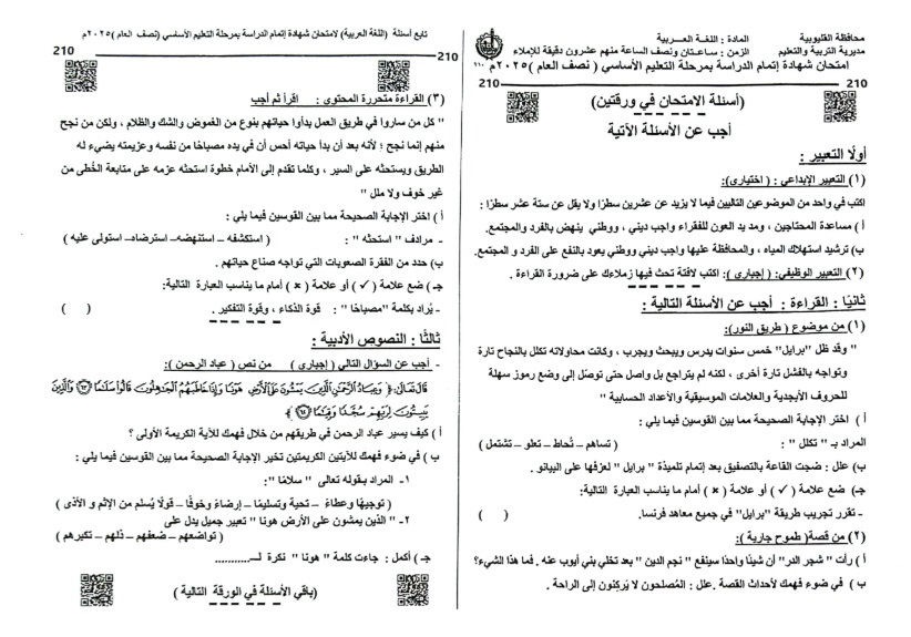 ننشر امتحان اللغة العربية للشهادة الاعدادية محافظة القاهرة 2025