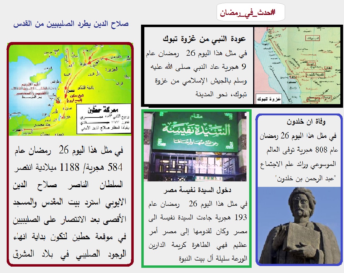 حدث في 26 رمضان .. عودة النبي من تبوك وانتصار صلاح الدين في حطين ووفاة ابن خلدون