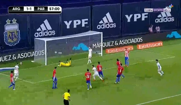 تعادل الارجنتين وباراجواى 1 / 1 بعد الغاء هدف ليونيل ميسي عن طريق الفار