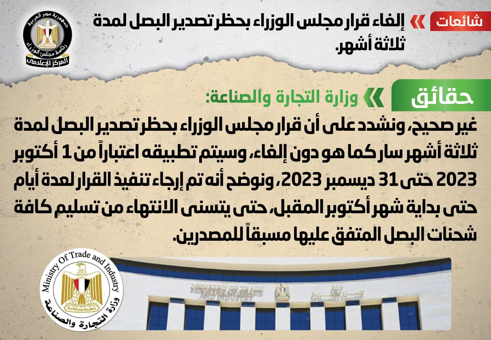تطبيق قرار حظر تصدير البصل لمدة 3 أشهر من ١ أكتوبر ٢٠٢٣