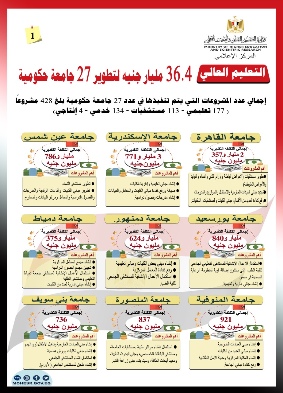 التعليم العالي توضح تفاصيل تنفيذ مشروعات تطوير بتكلفة تصل لـ 7 مليارات جنيه على مستوى الـ27 جامعة حكومية