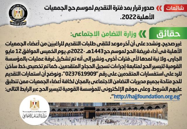 الحكومة تنفى صدور قرار بمد فترة التقديم لموسم حج الجمعيات الأهلية 2022