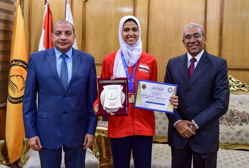 رئيس جامعة بني سويف يكرم بطلة التايكوندو بدورة الألعاب الإفريقية بالمغرب