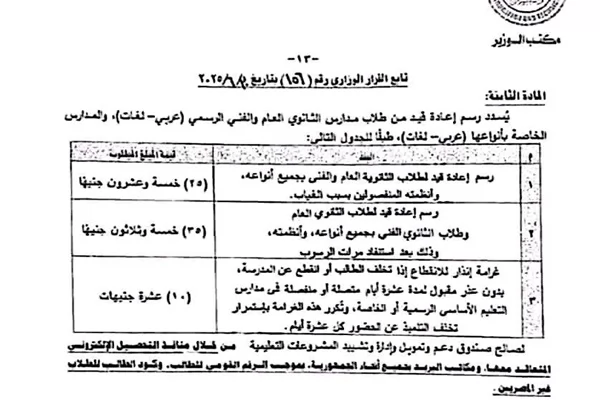 تحديد رسوم إعادة قيد الطلاب المفصولين والغياب بالثانوي