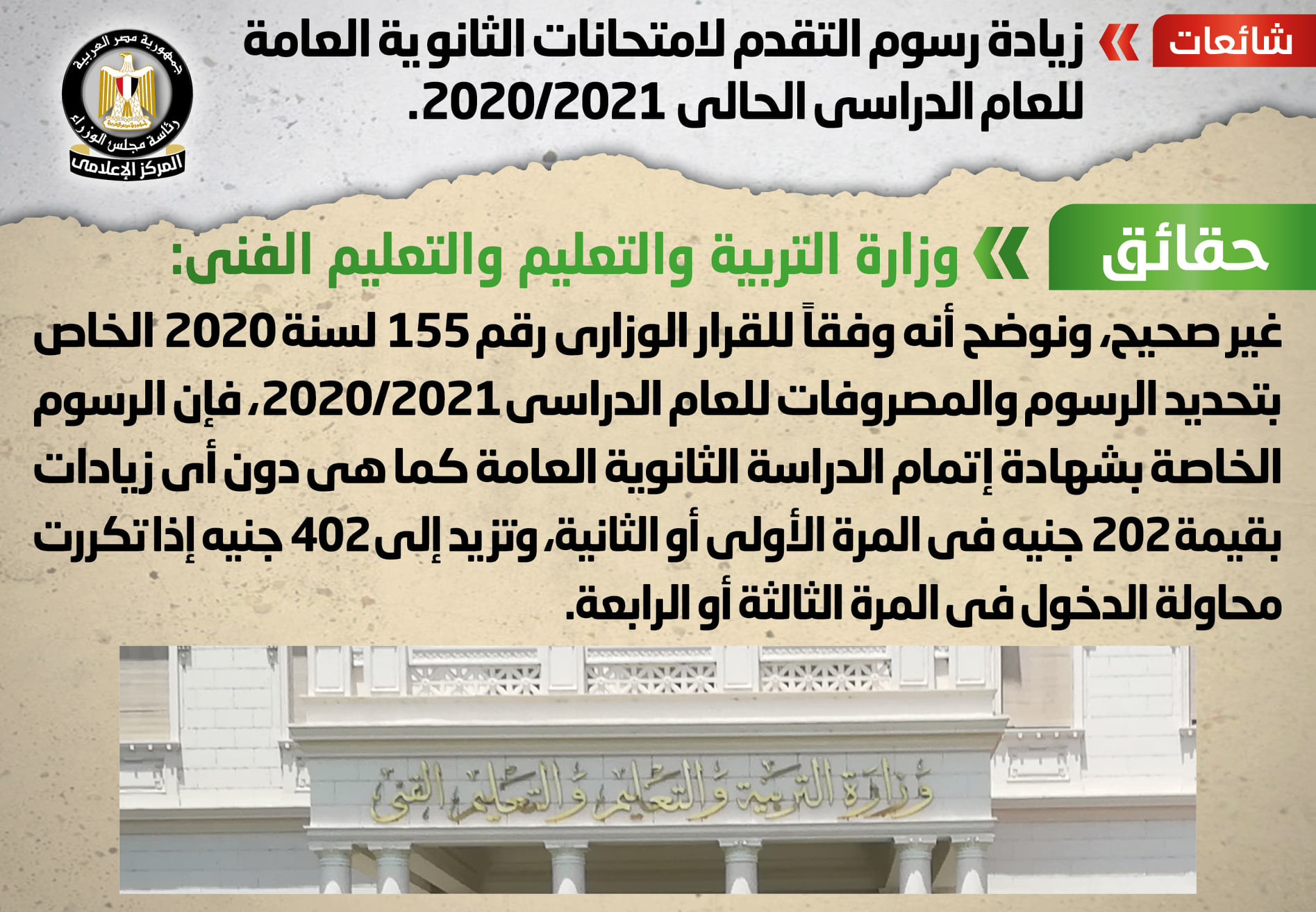 زيادة رسوم التقدم لامتحانات الثانوية العامة للعام الدراسي الحالي 20-21.." شائعة"