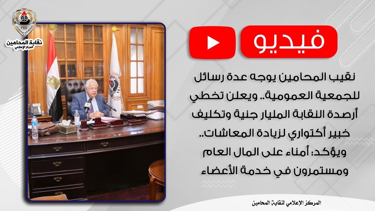 نقيب المحامين يوجه عدة رسائل للجمعية العمومية.. ويعلن تخطي أرصدة النقابة المليار جنية وتكليف خبير أكتواري لزيادة المعاشات
