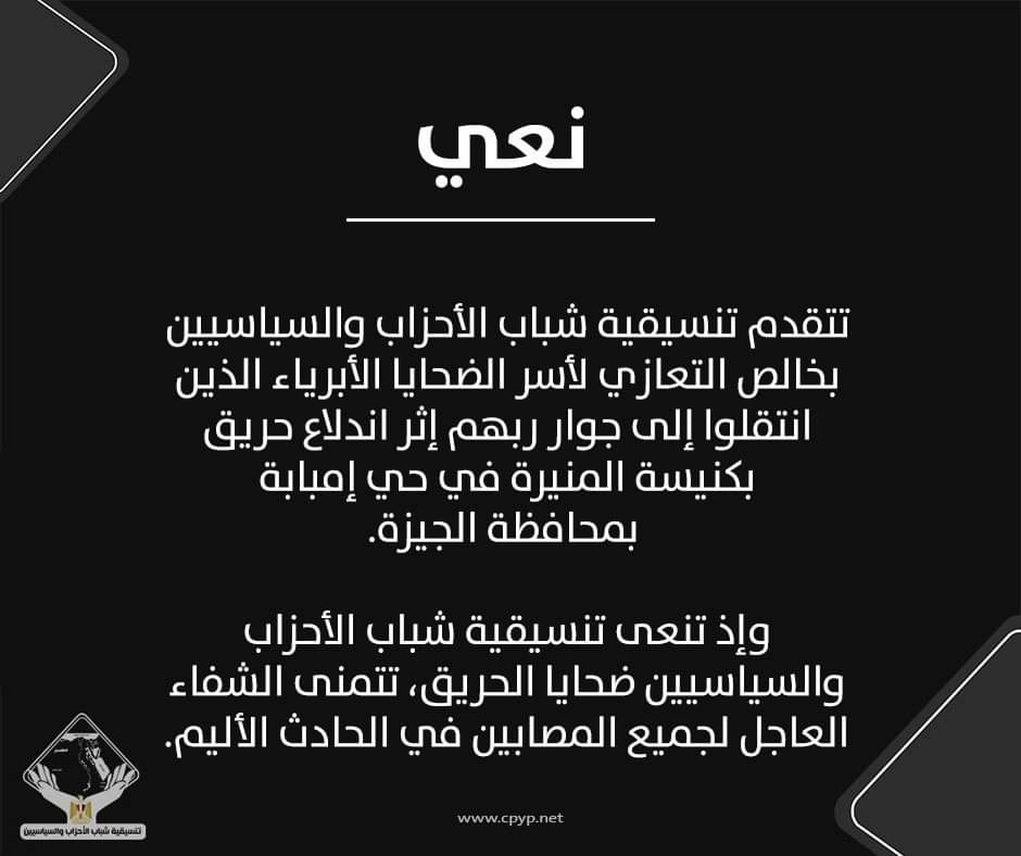 «تنسيقية شباب الأحزاب» تنعى ضحايا حريق كنيسة أبو سيفين.. وتتمنى الشفاء للمصابين