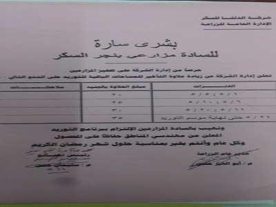 شركة الدلتا للسكر تعلن عن علاوه للمزراعين