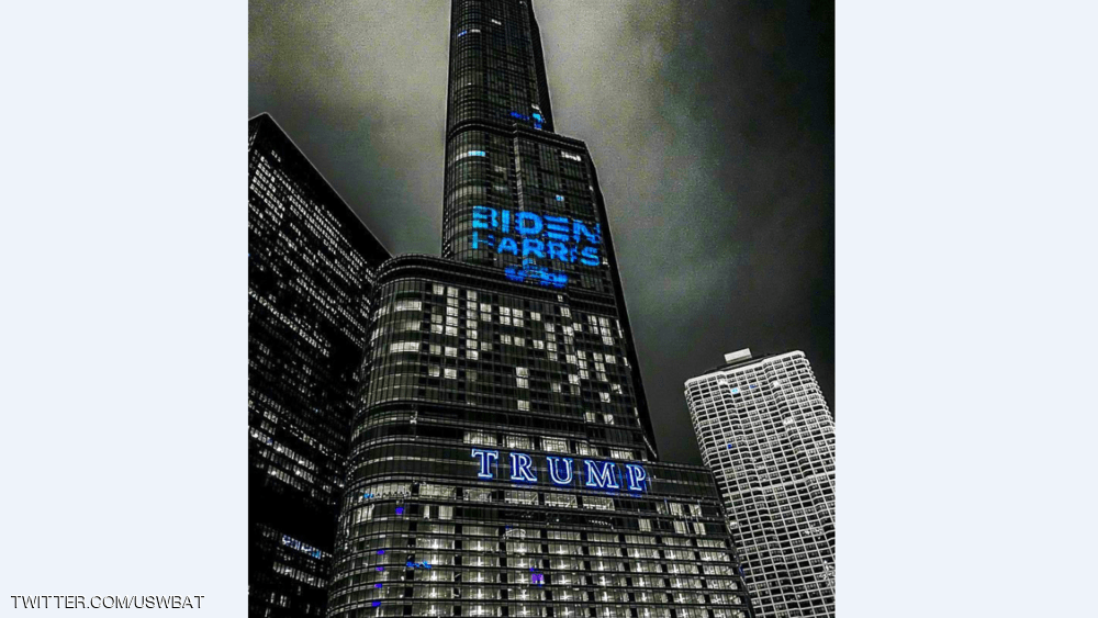 اسم بايدن يظهر على برج ترامب الدولي في شيكاغو
