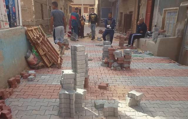 مواصلة تركيب بلاط الإنترلوك بتفرعات شارع الحدادين بمدينة صدفا