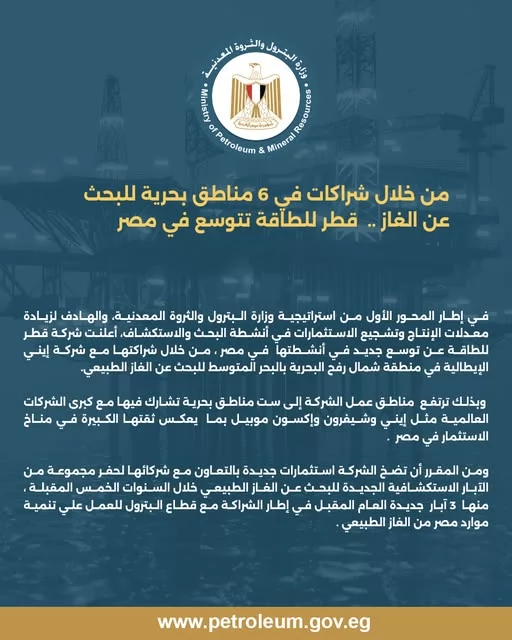 3 آبار جديدة العام المقبل.. البترول: قطر للطاقة تتوسع في مصر