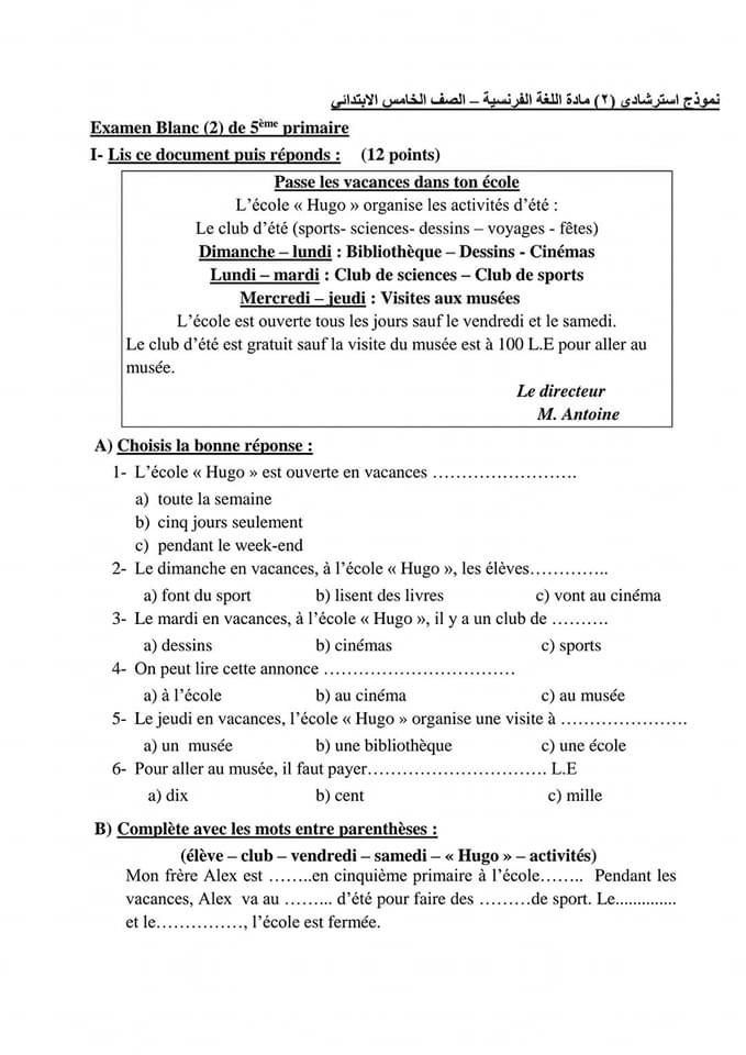 نموذج امتحان فرنساوى لخامسة الابتدائى.. يضمن لك التفوق