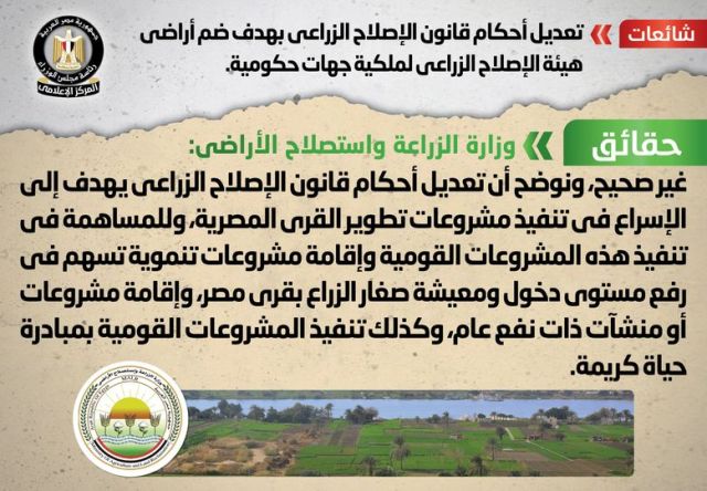 الحكومة تنفى تعديل أحكام قانون الإصلاح الزراعي بهدف ضم أراضي الهيئة لملكية جهات حكومية