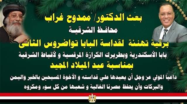 محافظالشرقية يُهنئ قداسة البابا تواضروس الثاني والأخوة الأقباط بعيد الميلاد المجيد