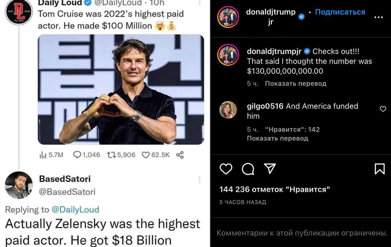 نجل ترامب ساخرا.. زيلينسكي الممثل الأعلى أجرا وليس توم كروز