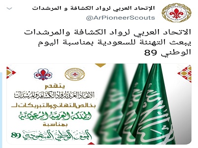 الاتحاد العربي لرواد الكشافة والمرشدات يبعث التهنئة للسعودية بمناسبة اليوم الوطني 89