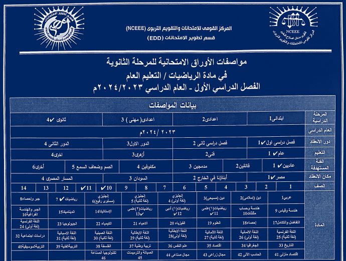 مواصفات الورقة الامتحانية للرياضيات لأولى وثانية ثانوي - ترم ثاني