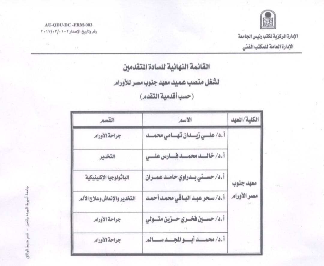 جامعة أسيوط تعلن القائمة النهائية للمرشحين لشغل منصب عميد