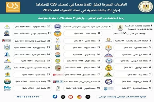 صعود الجامعات المصرية في تصنيف QS 2026 وانضمام 3 جامعات جديدة