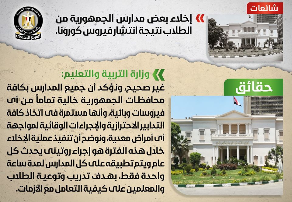 رسميا..الوزراء ينفى إخلاء بعض مدارس الجمهورية من الطلاب بسبب انتشار كورونا