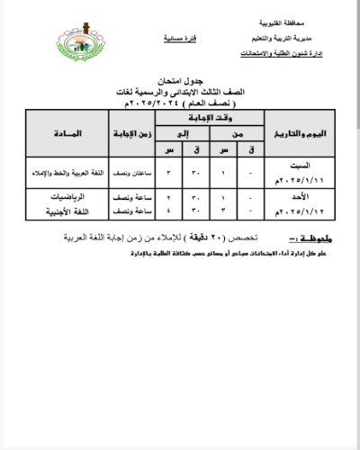ننشر جداول امتحانات الفصل الدراسي الأول للمرحلة الابتدائية