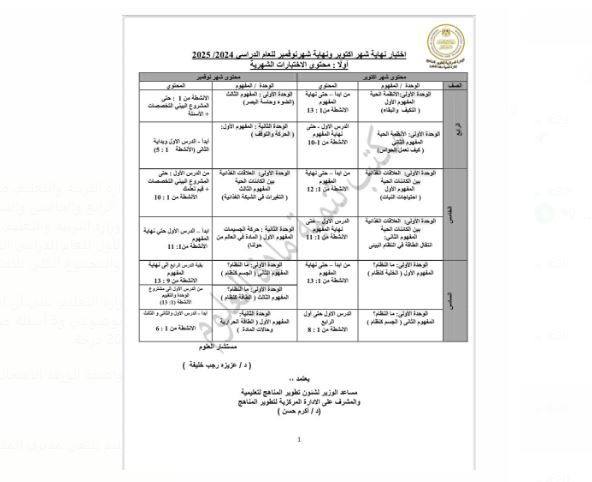 مواصفات امتحان العلوم لشهر أكتوبر لطلاب المرحلة الابتدائية