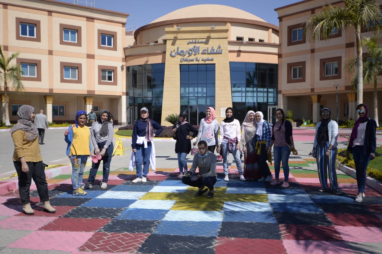 أساتذة وطلبة كلية الفنون بالأقصر يزينون واجهة ومدخل مستشفى شفاء الأورمان لعلاج الأورام